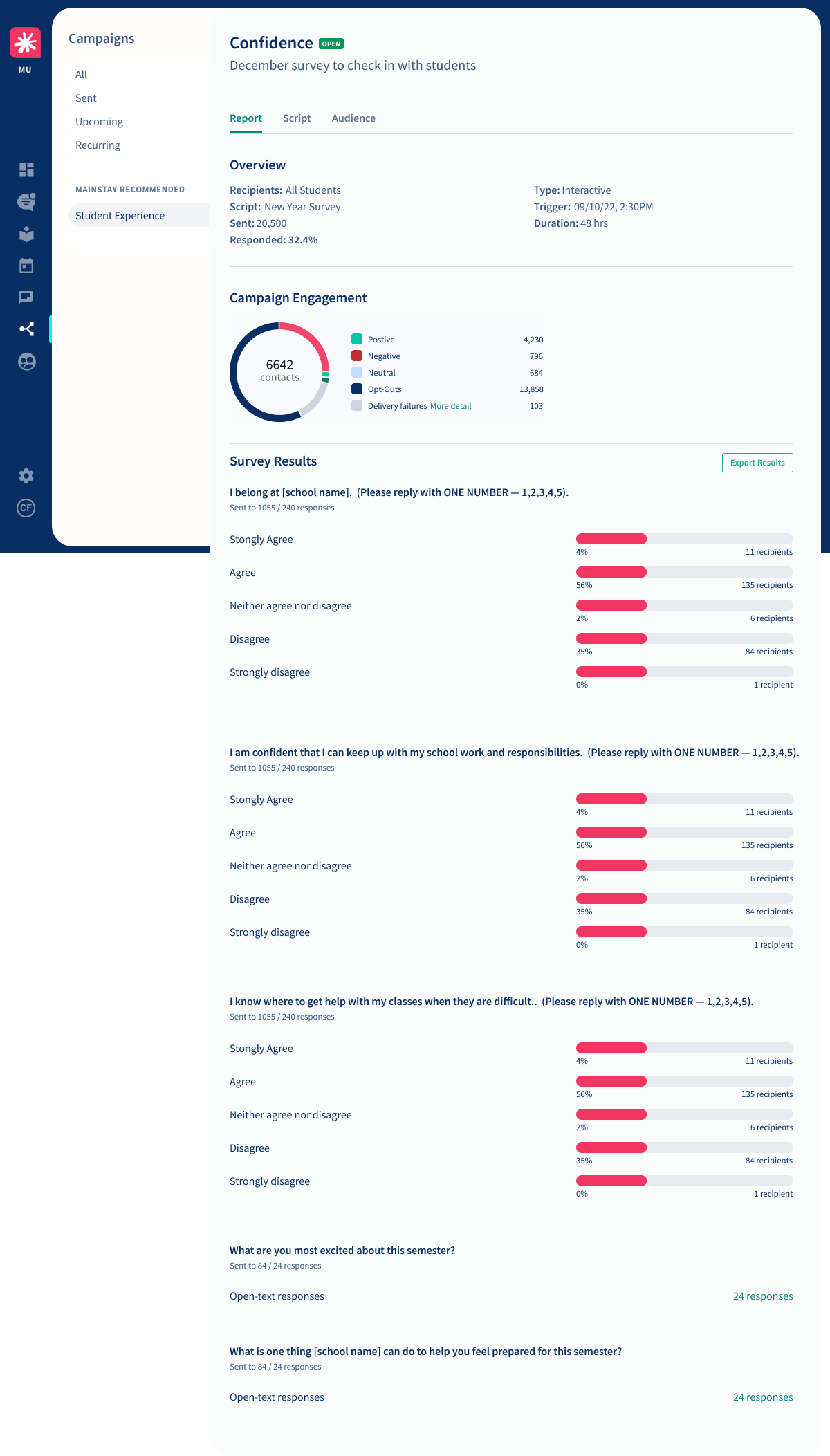 As Lead Product Designer, I was responsible for shaping the user experience of Mainstay’s AI platform. My focus was on making the communication between institutions and students more personalized, accessible, and impactful, ensuring that the platform was intuitive for both administrators and students.